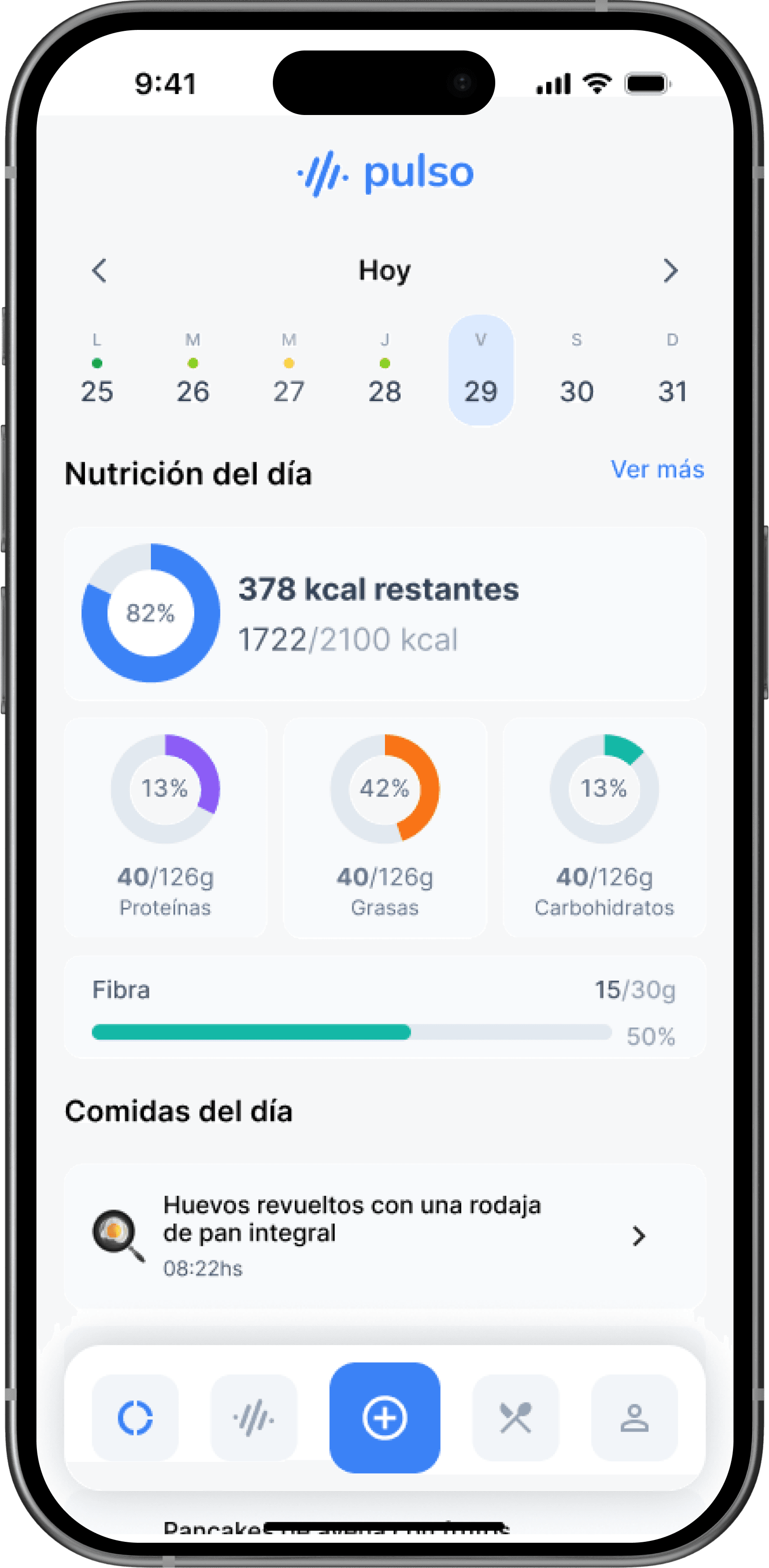 Pulso genera un programa nutricional a tu medida, con objetivos diarios de calorías, macronutrientes y micronutrientes.